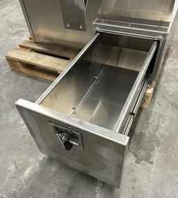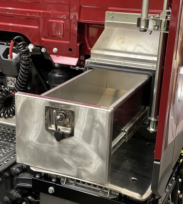 Förvaringslåda i aluminium med skjutlåda för DAF XG och XG+. Färdiggjord för montering på baksidan av hytten. Inklusive lås!